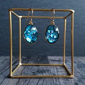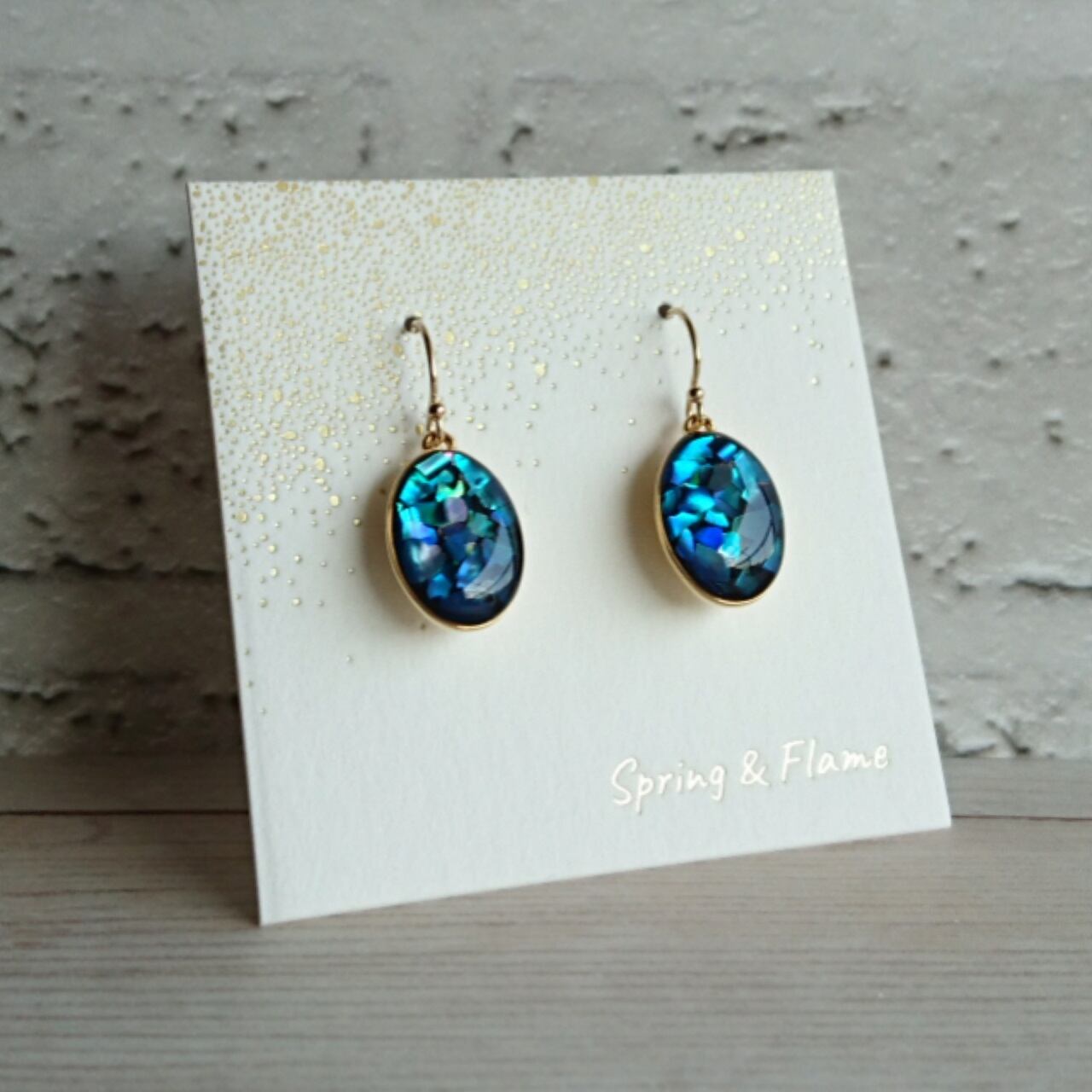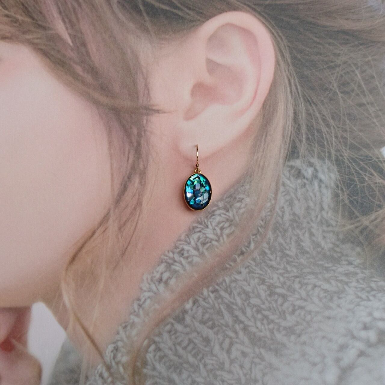 ピアスが揺れるたびに青いシェル片が輝き、明るい南の海の色から、深い海のブルーまで、様々にきらめきながら耳元を飾ります。