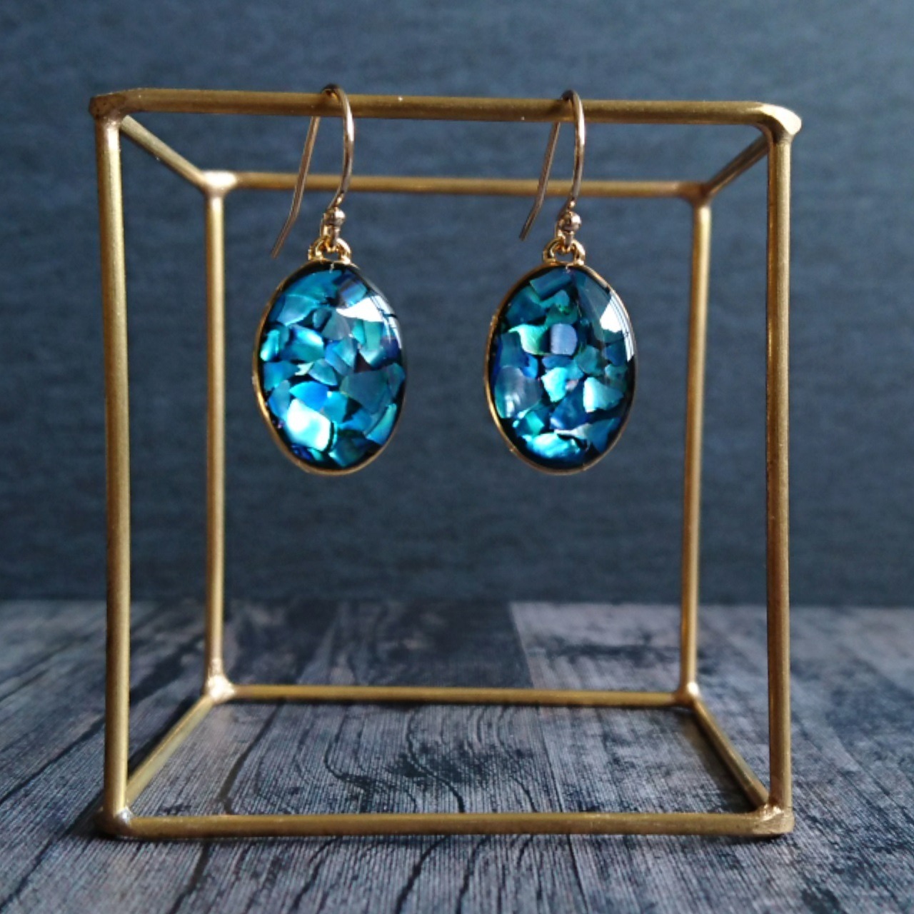 ころんとした楕円形の中に、少しずつ色の違うブルーのシェルチップを、UVレジンで何層にも敷きつめています。